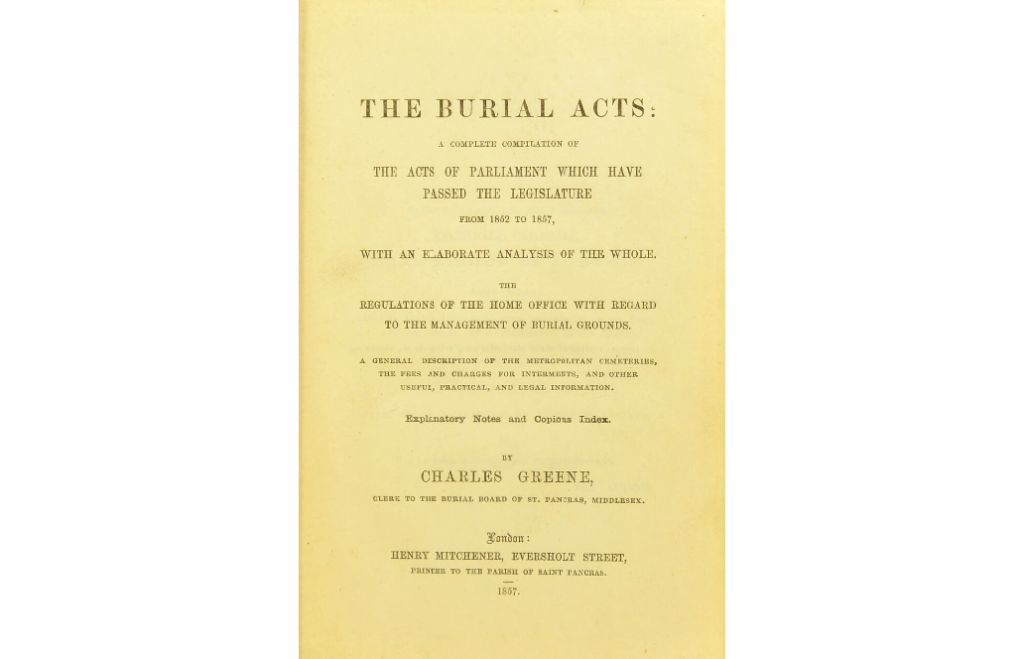 Throughout the twentieth century, sociologists and historians have sought to examine the Victorian state and its efficacy in governance. The nineteenth century was a period of laissez-faire politico-economic policy, in which the government sought to have minimal interaction in the affairs of the state. Many sociologists and historians argue that instead of direct intervention, the British government in the nineteenth century sought to exercise power in more subtle, less interventionist ways, which would condition society into conforming to a particular conduct of obedience.[1] This section of Burial and Burial Grounds will, therefore, utilise Charles Greene’s 1857 book on the Burial Acts to explore how the standardisation of burial practices, which sought to promote religious morality whilst mitigating the spread of disease, was a mechanism of state power. The marriage of sanitary concerns alongside moral unease fostered a particular mode of conduct and expressed state power. A power that surveyed, disciplined and governed nineteenth-century society.