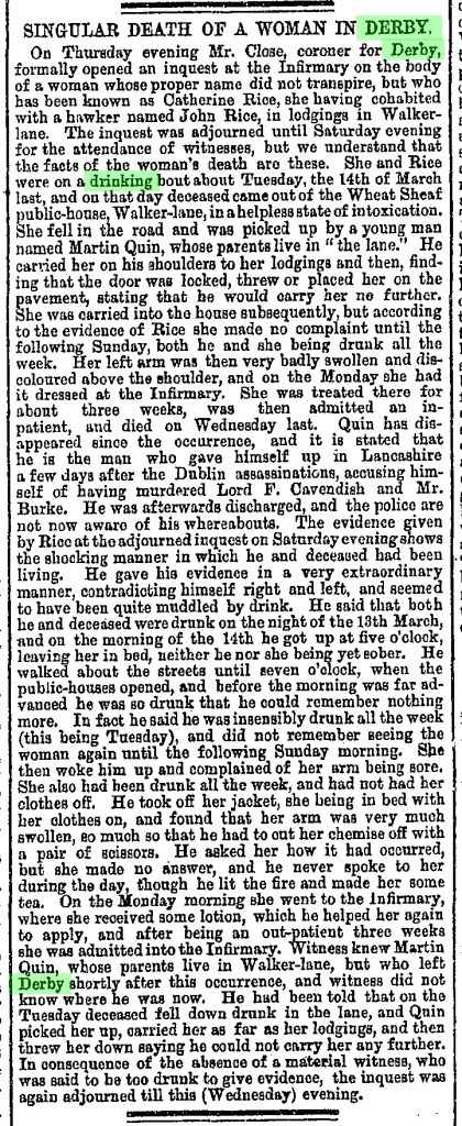On May 31, 1882, the Derby Mercury published a brief article on the “singular death” of a woman named Catherine Rice.[1] The announcement states that Mr Close, coroner for Derby, “formally opened an inquest” into the death of the woman who died at Derby Infirmary. The reason for this investigation was the suspicious circumstances in which Catherine Rice suffered injuries to her left shoulder that eventually led to her death. The inquest was adjourned for further analyses due to the absence of one of the main witnesses, Martin Quinn, who carried the woman to the front door of her lodgings in Walker-lane Derby. From the short publication, we understand that the woman was in a helpless state due to intoxication caused by the use of alcohol. The story also included a hawker John Rice, who cohabited with her but remembered almost nothing because he was drunk.