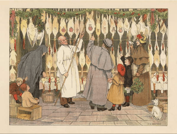 To the right: Bedford, F. D., Victorian family choosing a turkey for Christmas at the poulterers, Chromolithograph, 1899.