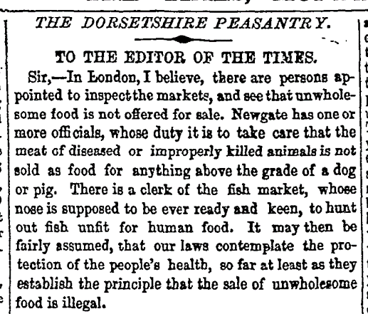 To the left: Excerpt from Osborne, S. G., ‘The Dorsetshire Peasantry’, The Times, Issue 19323, 24 August 1846, p. 5.