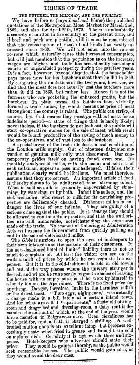 Food adulteration in nineteenth-century England was becoming more common at the expense of people’s lives. It is important to note that the food adulteration of the modern age is not generally a risk to a person’s life or physical health unlike in the nineteenth to the early twentieth century. According to ‘Tricks of the Trade’, an 1872 Derby Mercury article, meat has become more expensive, and this money is going into the butcher’s pocket. Milk was also being adulterated at an alarming rate with the Mercury article claiming to have only found one genuine milk seller out of nineteen.[2] ‘Tricks of the Trade’ is an example of the prevalence of public health concerns in the nineteenth century. In many cases, adulterous food was considered an “act of fraud” and this “network of food scares” helped to develop the food laws of Britain.[3]
