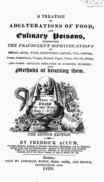 Chemist Frederick Accum in his 1820 book ‘A Treatise on Adulterations of Food and Culinary Poisons’ was one of the first to tackle the problem of food adulteration and its seriousness. He was especially concerned for the welfare of children who were much more susceptible to illness from sweet treats such as jellies. Frederick Accum publicised the names of numerous merchants that sold adulterated food and although Accum’s work did not lead to any immediate legislative changes, it has been hailed as the start of the “anti-adulteration movement”.[4]