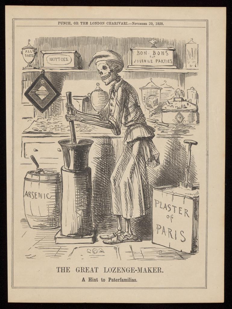 ‘Death as a Lethal Confectioner’ illustrates the 1858 Bradford Sweets Poisoning and links it directly to the introduction of the “privately sponsored” 1860 Adulteration of Food and Drink Act which the Derby Mercury argued was not enough to solve the growing concerns surrounding public health and safety.[19] It later developed into the more standardised food safety legislation we have today and is helpful in showing the influence of major food adulteration scandals on societal views of food regulation and its eventual impact on the legally permitted use of food substitutes. This ‘Lethal Confectioner Making up Sweets’ paints a picture of the view of loss in relation to food regulation and further supports the notions put forward in ‘Tricks of the Trade’ as it represents the public opinion on the impact of adulterated, unwholesome food on public health.